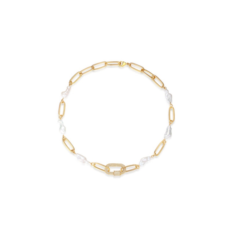 This paperclip link chain and baroque pearl necklace is a must have for any wardrobe. The irregular, freeform shape of baroque pearls can bring a more casual vibe to a silk shirt or strappy camisole, and their luster complements a tan beautifully. At the same time, they can be used to add a sense of glamour to the most everyday outfit.