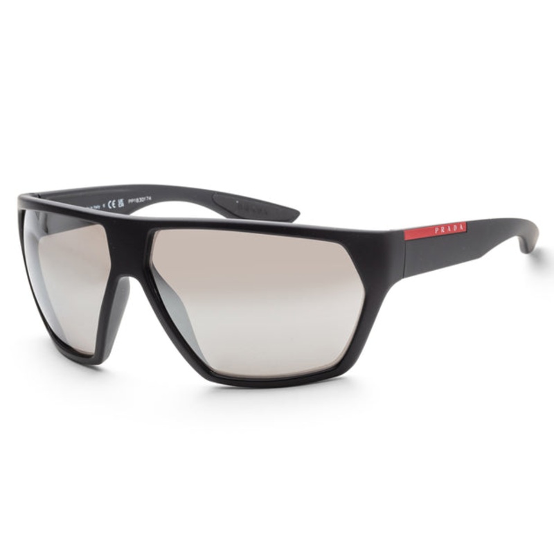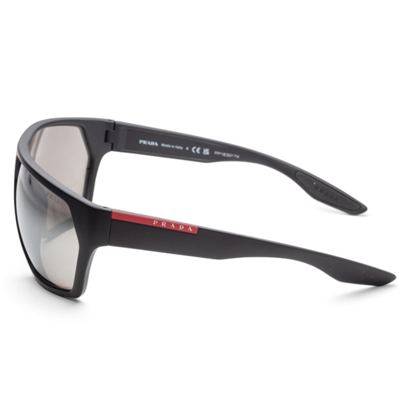 Dimensions – 67 mm x 12 mm x 130 mm. The frame is plastic geometric shape. The lenses are grey polarized and the frame is black. (PS08US-DG02B067)